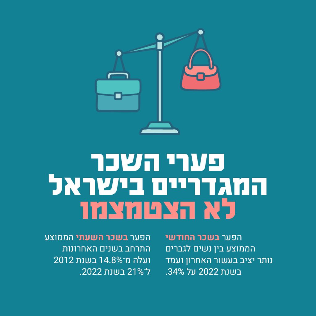 על אף שנשים בישראל משתלבות יותר ויותר בשוק העבודה, רבות מהן משכילות וממלאות תפקידים מרכזיים בכלכלה, פערי השכר נותרים יציבים וגבוהים. הפער בשכר החודשי הממוצע בין נשים לגברים נותר יציב בעשור האחרון ועמד בשנת 2022 על 34%. הפער בשכר השעתי הממוצע התרחב בשנים האחרונות ועלה מ־14.8% בשנת 2012 ל־21% בשנת 2022.